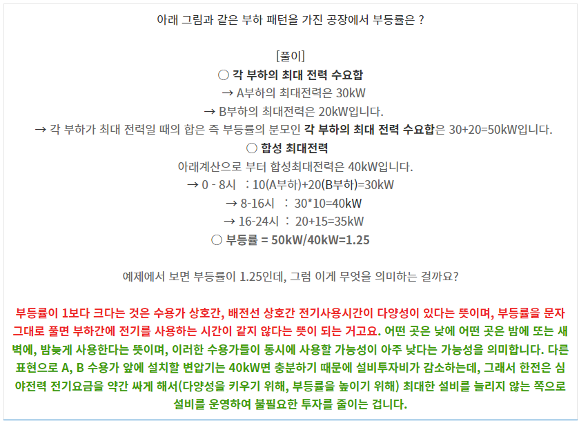 부하율은 같은 의미이지만 두가지 관점으로 접근하는 것이 맞는 것 같고요. - 먼저 발전소 입장에서 보면 평균수요전력이 낮은 경우(부하율이 작은 경우) 효율이 낮은 범위에서 발전소를 운영하거나, 발전소를 기동정지를 자주 해야하는 상황이 되는 거고요. 아래 그림은 일일부하를 나타내주는 그래프인데, 발전소의 에너지 효율을 최대로 높히려면 파도치는 부위(피크부하)가 없이 직선으로 가는 것이 가장 좋은데, 이때는 최대수요전력과 평균수요전력이 같아지는 때입니다.- 소비자측에서 보면, 우리가 보통 아는 것은 여름/겨울 피크부하에 전기를 조금 덜 사용하는 것이 발전설비를 증가시키지 않아 국가적인 낭비를 막는 것이고(모든 소비자, 상업 또는 산업의 경우 피크 수요를 낮추는 것) 결과적으로 전기 요금을 줄이는 첫 번째 단계가 될 것입니다.- 정리를 하면 평균수요전력은 일일평균을 기준으로 했을 때, 24시간 동안 사용한 전력량의 평균이고, , 최대수요전력은 피크부하일 때 최대로 사용하는 전력으로 생각하시면 됩니다.