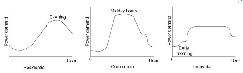아래 그림에서 보시는 것 처럼, 전기 사용량은 일반 가정집 소비자, 상업용 소비자, 산업소비자등의 성격에 따라 일일 전기 사용량이 시간대마다 다르다는 것을 아실 수 있습니다. 일반 가정집은 아침부터 약간씩 전기사용량이 늘어나면서 저녁퇴근 시간후에 본격적으로 전기를 사용하는 패턴을 보이며, 상업용 소비자는 9시 근처에 출근을 해서 저녁 7시 근처에 전기 사용량이 급감하는 패턴을, 산업용은 조금 일찍 6시부터 전기 사용량이 늘어서 밤 늦게까지 일정한 패턴을 보이고 있습니다. 한국은 이 전기 패턴과 조금 다르긴 한데 유사한 면이 있긴 합니다. 이 아래 그림에서 보시면 항상 어느정도 일정한 양의 전기가 사용되는 부분이 있고, 몇시간만 올라가는 경우도 있다는 겁니다. 마찬가지로 여기서 중요한 것은 다수의 소비자가 있는 아파트, 한전 주상변압기 한대에 연결되어 있는 여러 소비자들의 전기 사용 패턴이 있다는 것을 아는 것이 중요합니다.