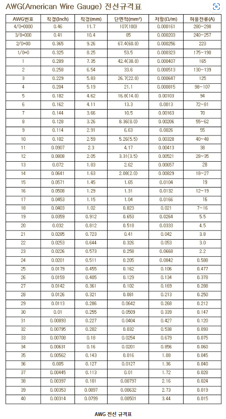 미국의 전선 규격입니다. AWG 숫자가 클수록 전선의 굵기 및 허용전류는 작아지며, AWG 숫자가 작을수록 전선의 굵기 및 허용전류는 증가합니다.