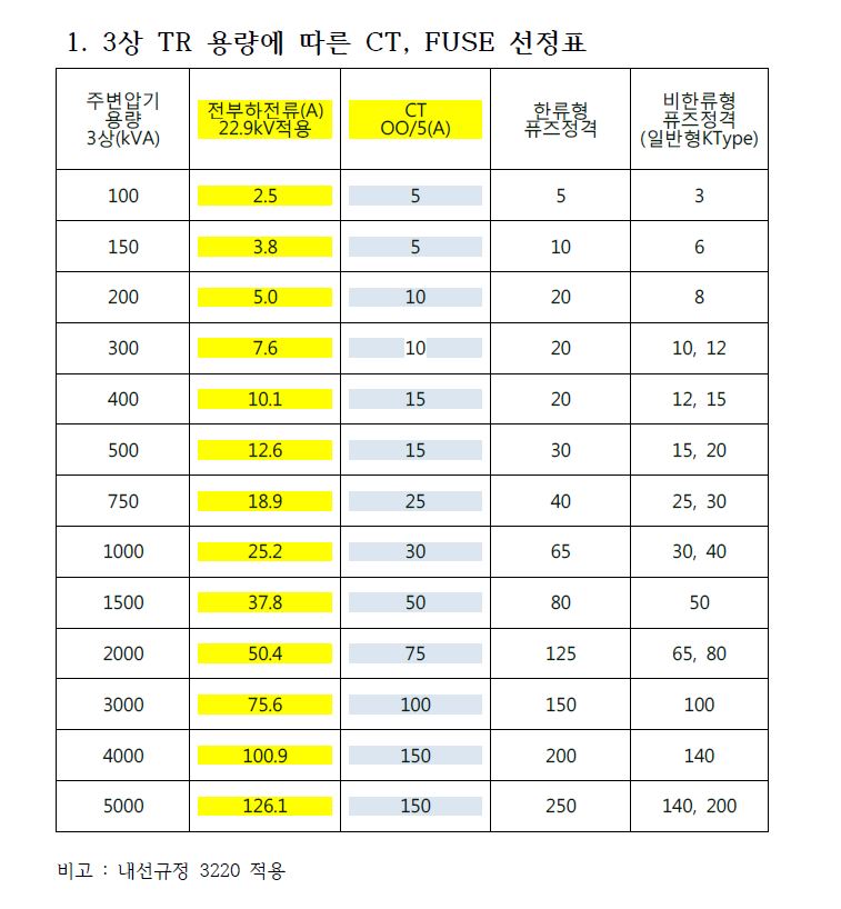 3상 TR 용량에 따른 CT, FUSE 선정표