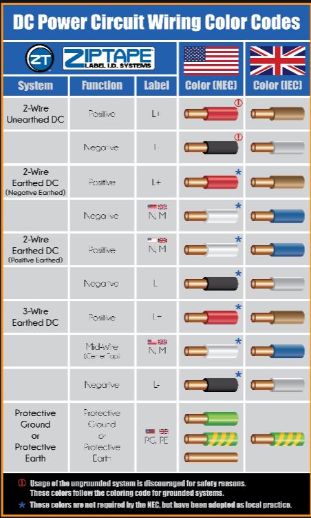 미국 및 국제규격 DC 케이블 색상입니다.